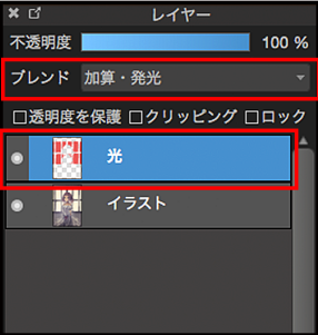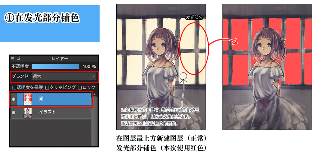 将铺为红色的图层混合模式由「正常」变为「发光」(变更后红色会 变为白色)