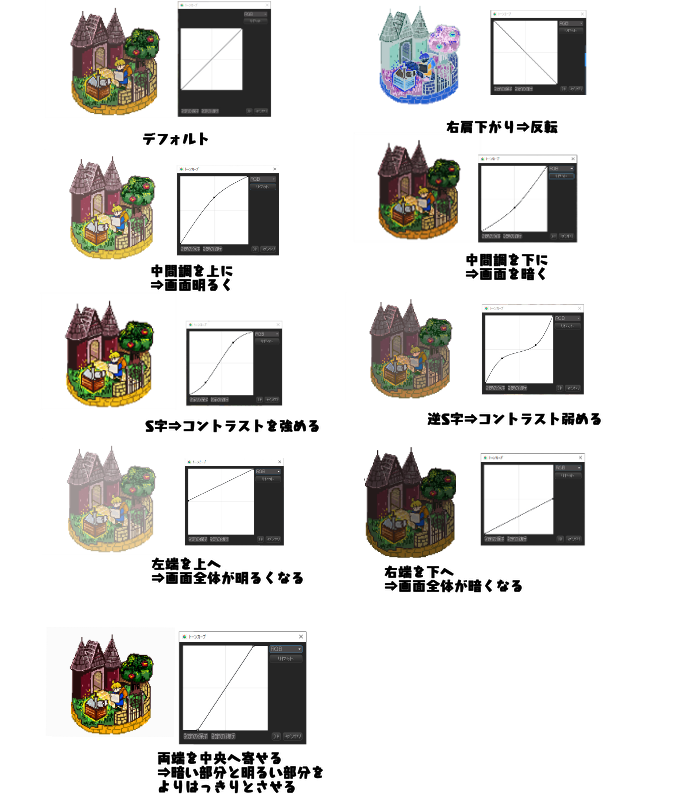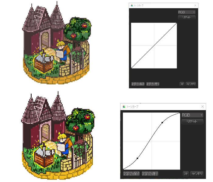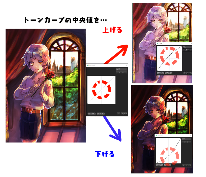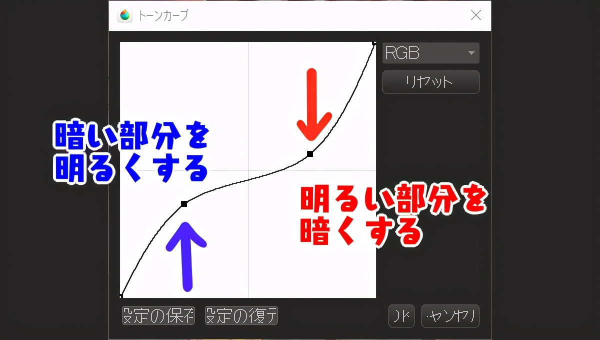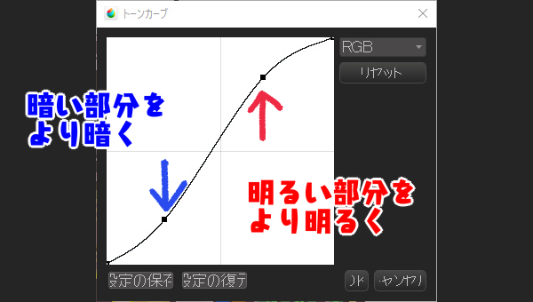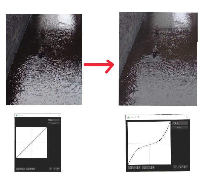 另外,降低色调曲线的中央时,可以看到在保持对比度的情况下画面变暗。
