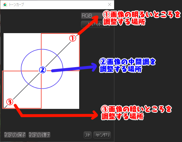 右上(下面的图像1的区域)表示调整图像的明亮的地方的地方,左下(下面的图像3的区域)表示调整图像的暗处的地方。