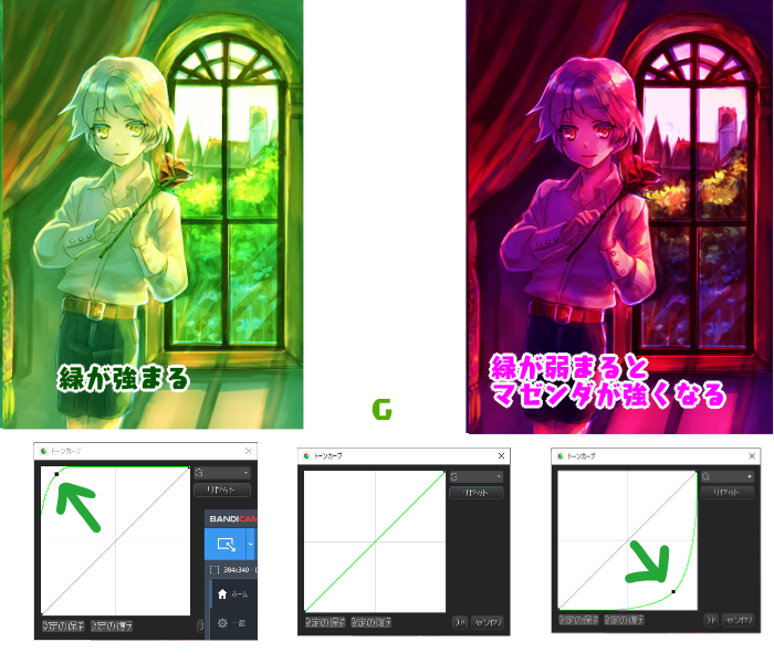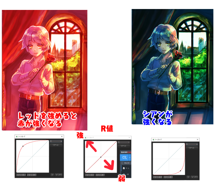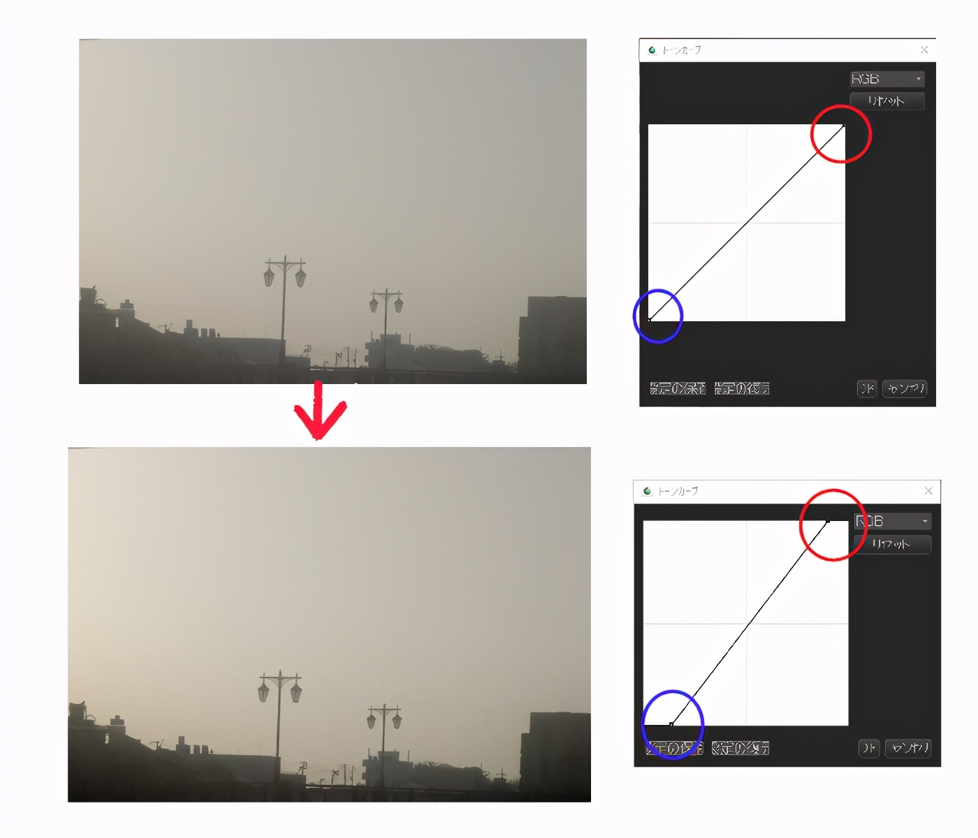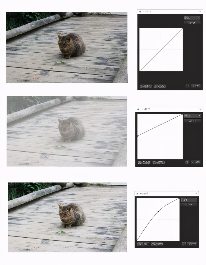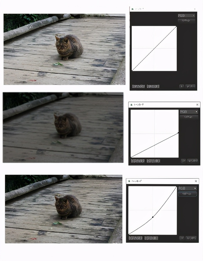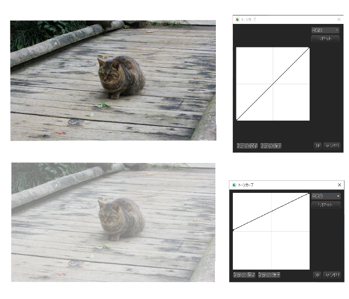 提高色调曲线的中央时,在维持原来图像的灰度的情况下画面变亮,与此相对,只上升左端的情况下,对比度就不能维持了,这一点是可以看到的。