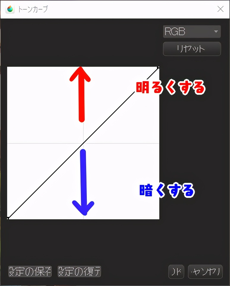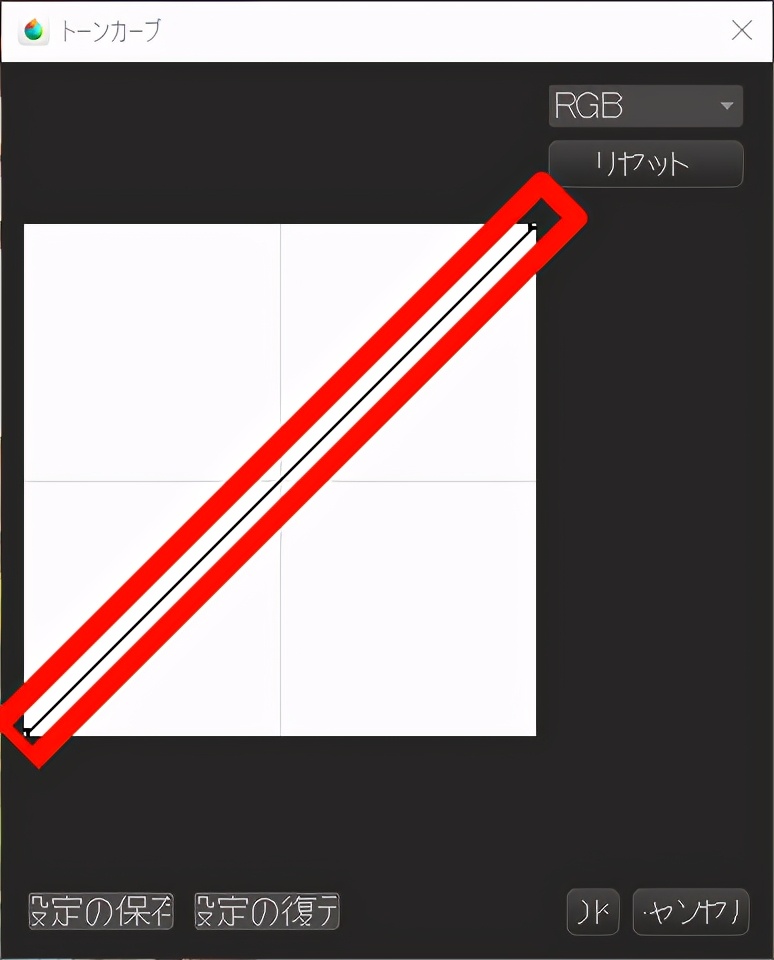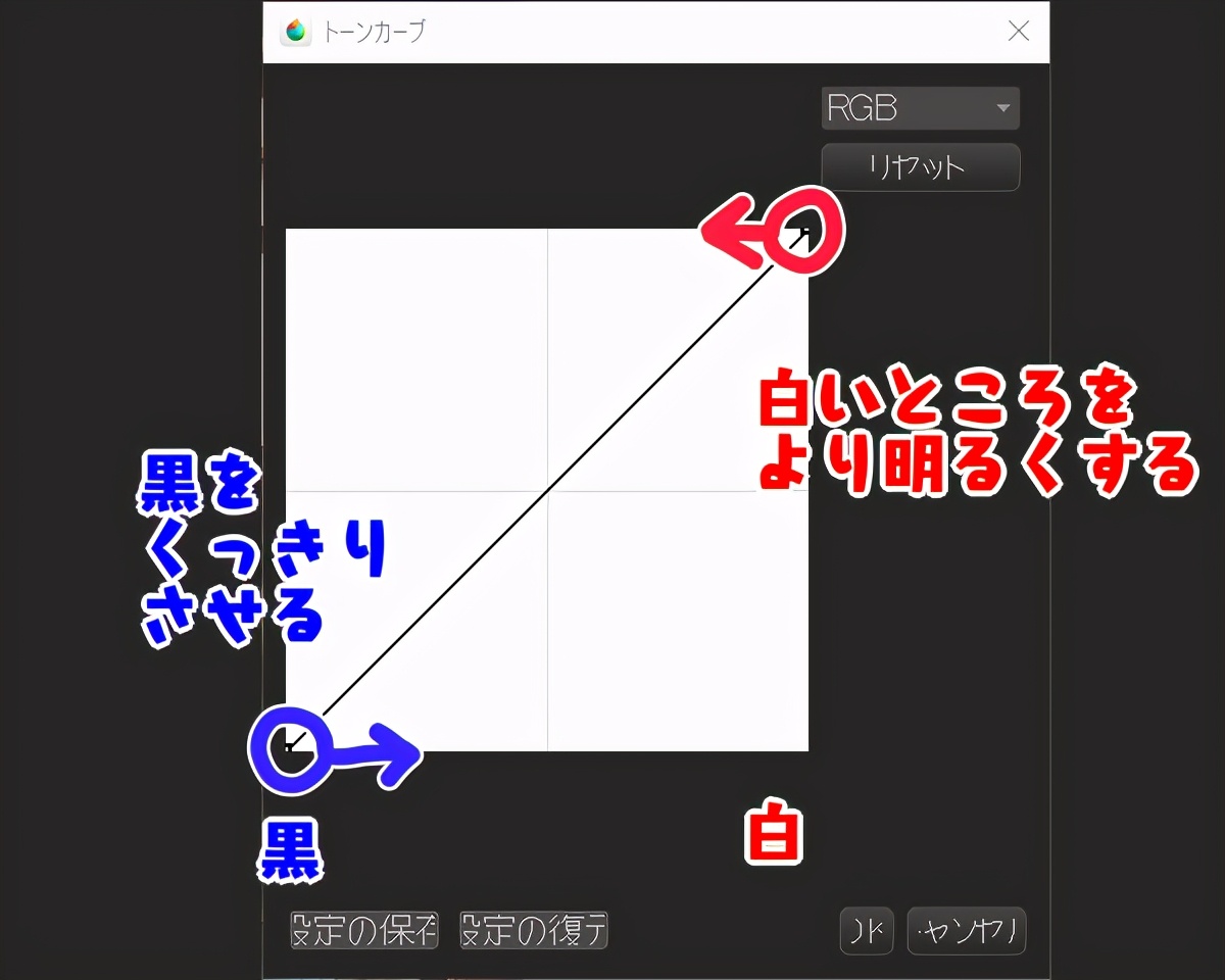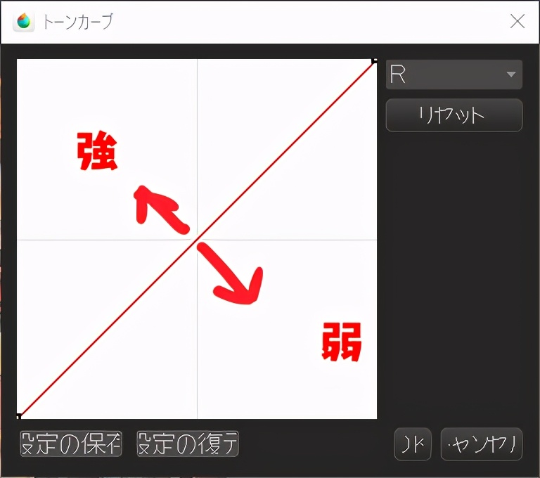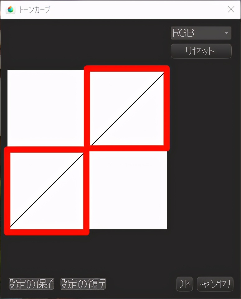 色调曲线画面由1四角的区域、2上升的色调曲线、这两个要素构成。