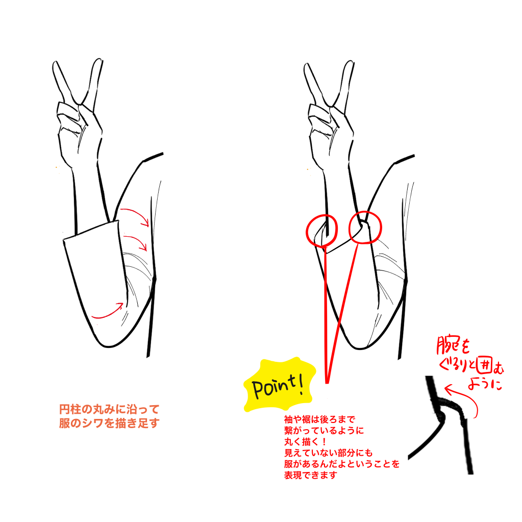 具体来说,在右边的插图中,轮廓和阴影是用钢笔工具绘制的,而衣服上的皱纹是用铅笔工具绘制的。
