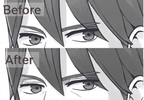 在这里,在前面的过程中在眼睛上方绘制凹痕的同时,眼睛变窄了。