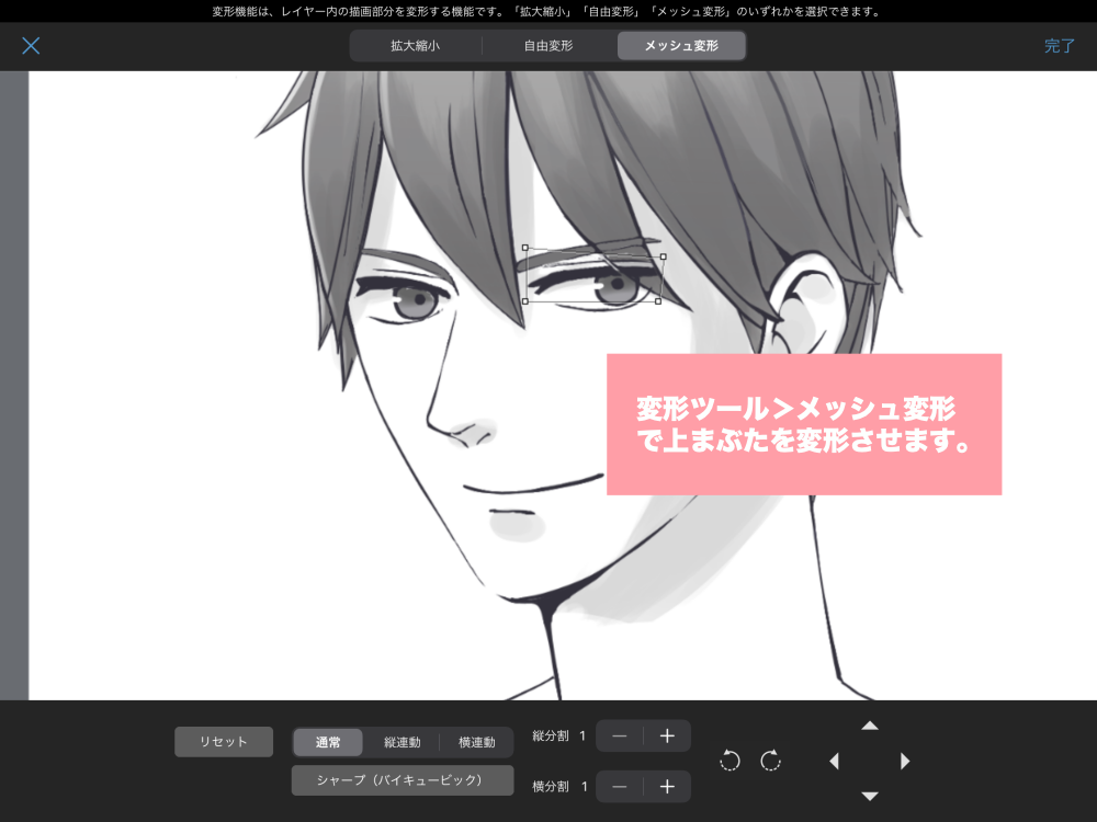 在这里,在选择中选择眼睛的上侧,并使用网格变形将眼睑展平。