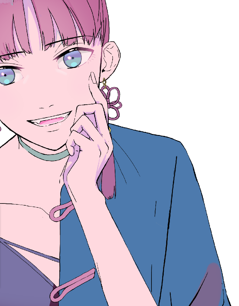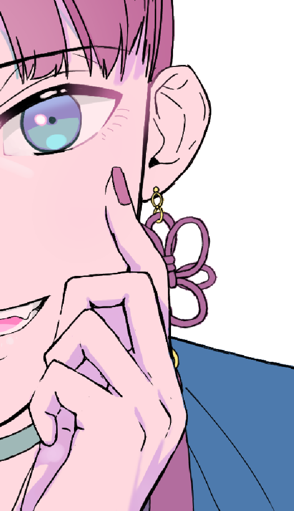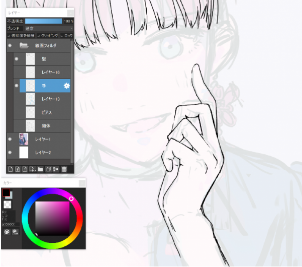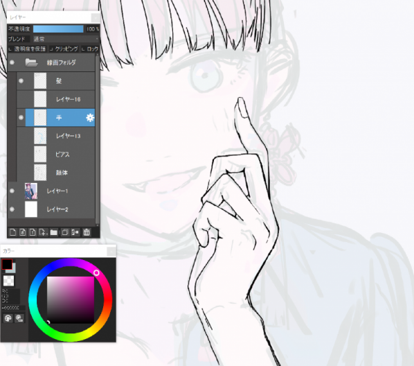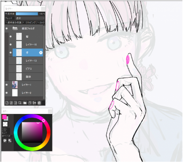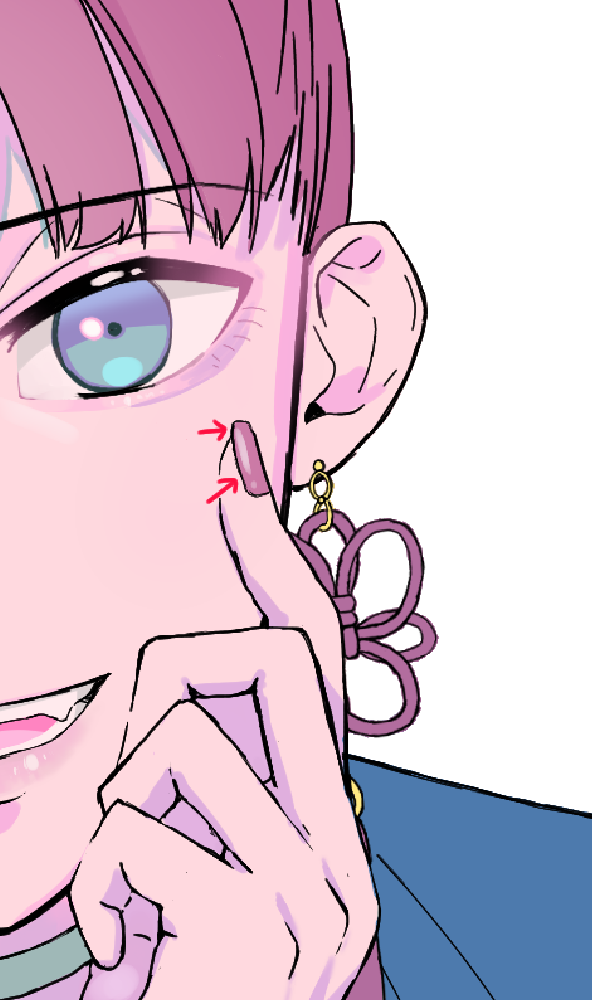 为了表现出像吸住的柔软的脸颊和奢华的指尖,把手指腹部等与脸颊接触的部分的手指的线条画消失了。