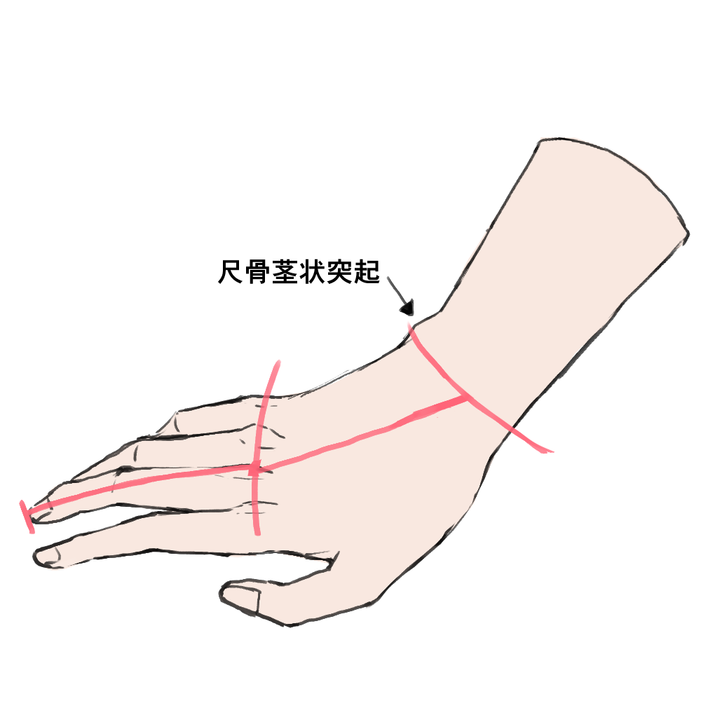 手从尺骨的茎状突起到手背的长度等于中指的长度。