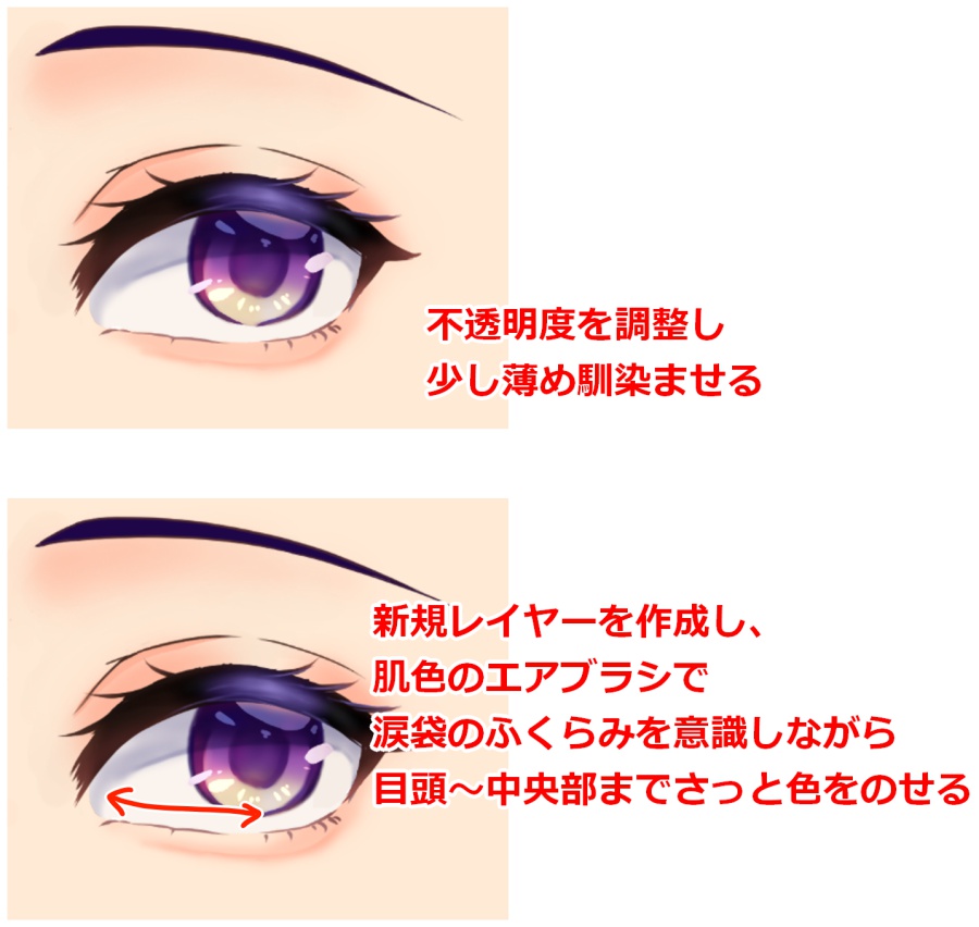 创建一个新图层并使用肉色喷枪在泪袋的上侧从内角到眼睛中心涂抹颜色。