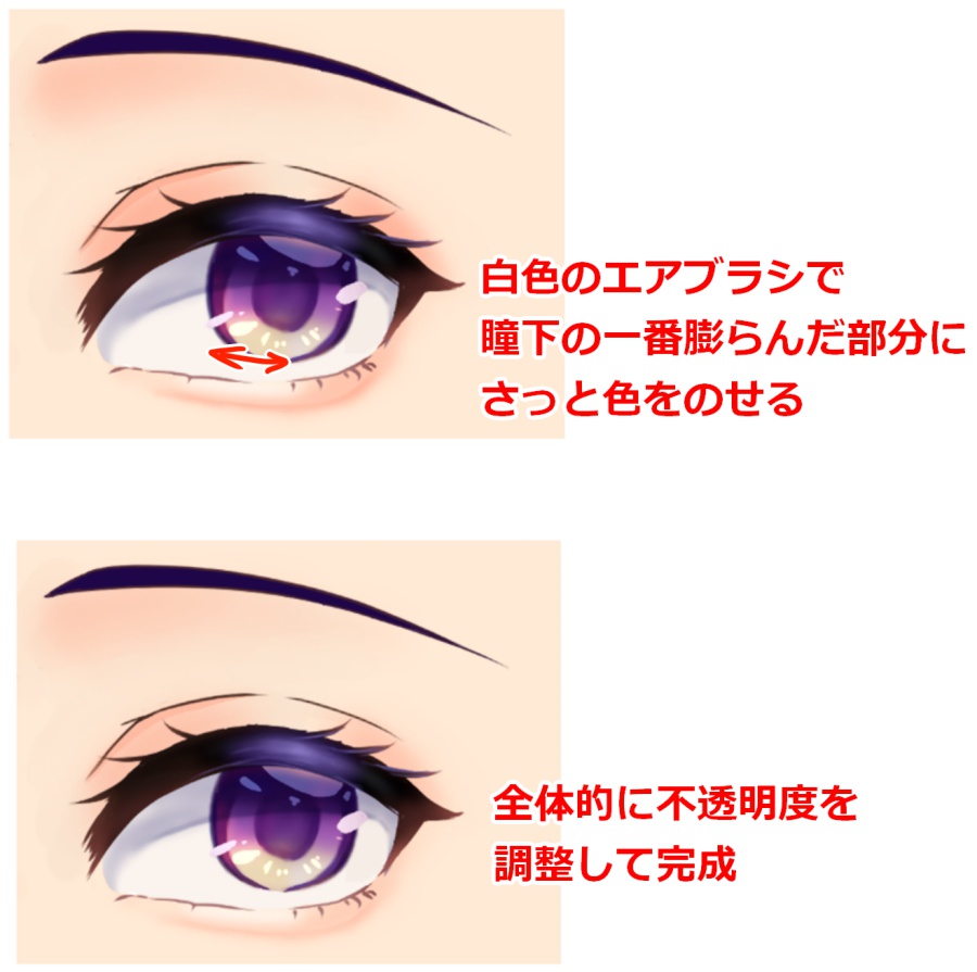 使用白色喷枪,快速为眼睛下方泪囊膨胀的部分涂上颜色并增加光泽。