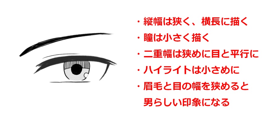 眼睛比女性小,与眼睛平行的双线画得更窄,给人一种端庄的印象。