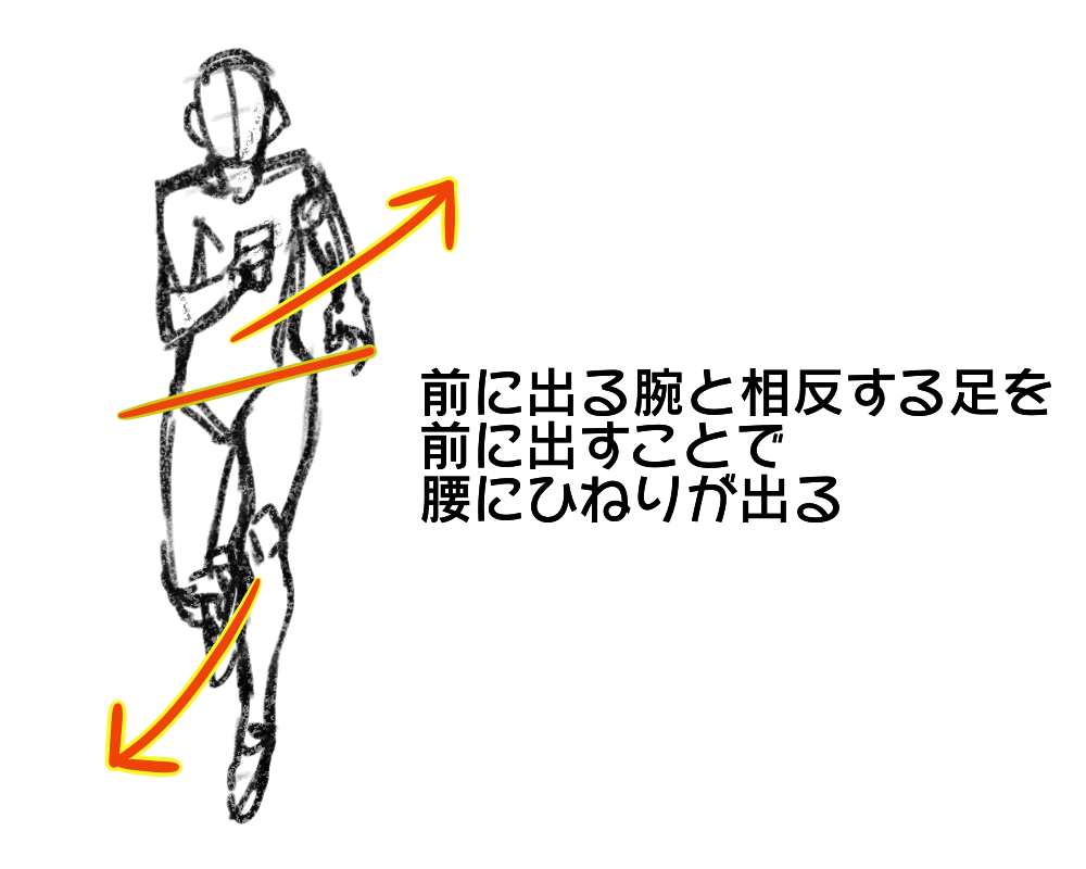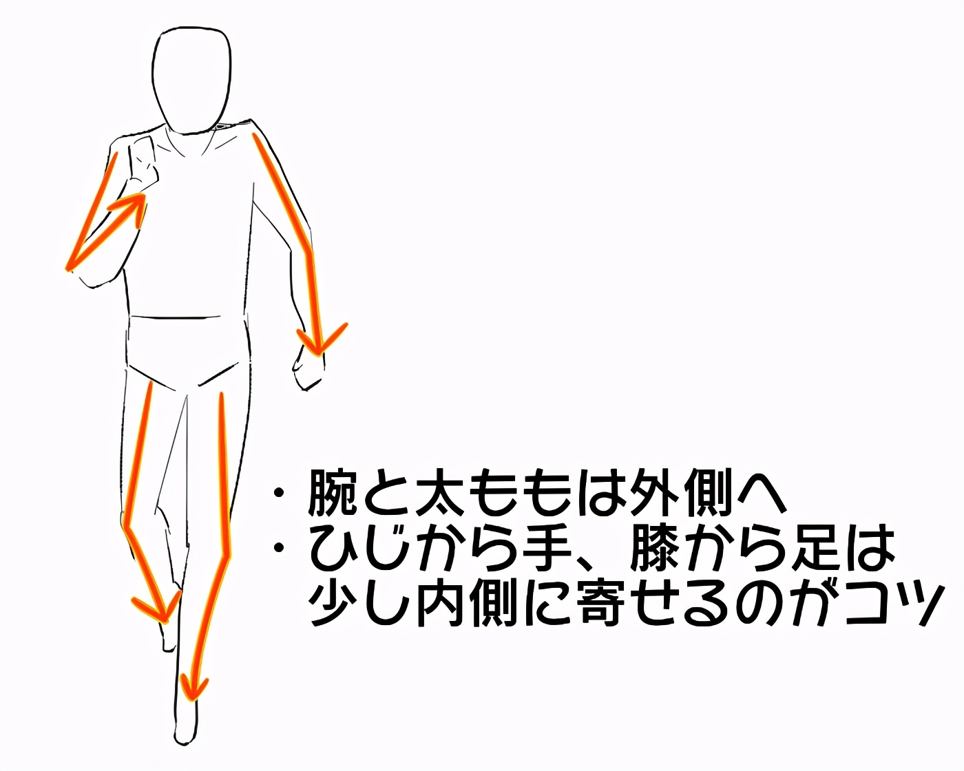 从正面画跑步姿势时,如果手脚垂直上下移动,往往会是一个奇怪的姿势。