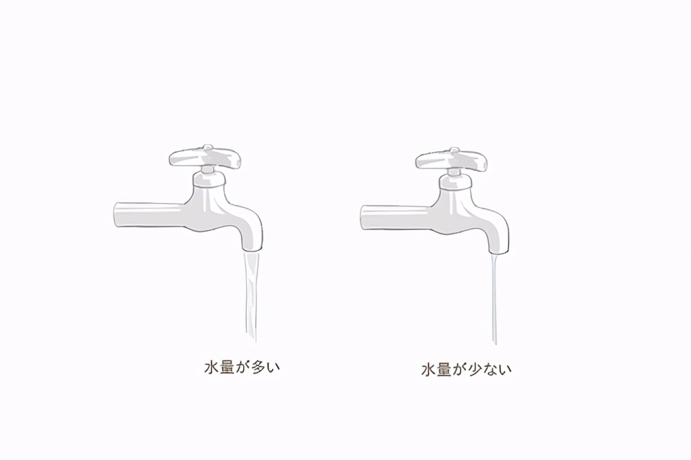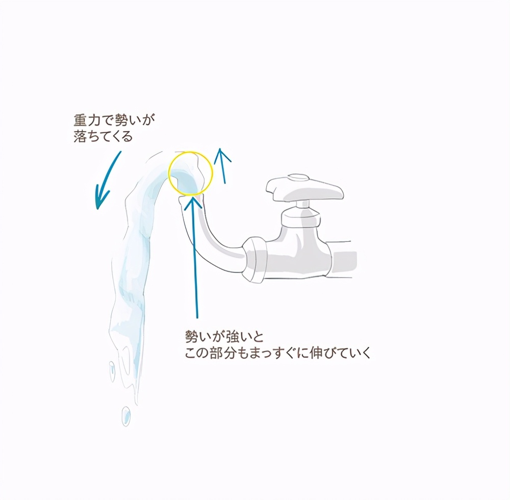 从水龙头出来的水是笔直流下的,水量少时水宽变窄,水量大时水宽变宽。