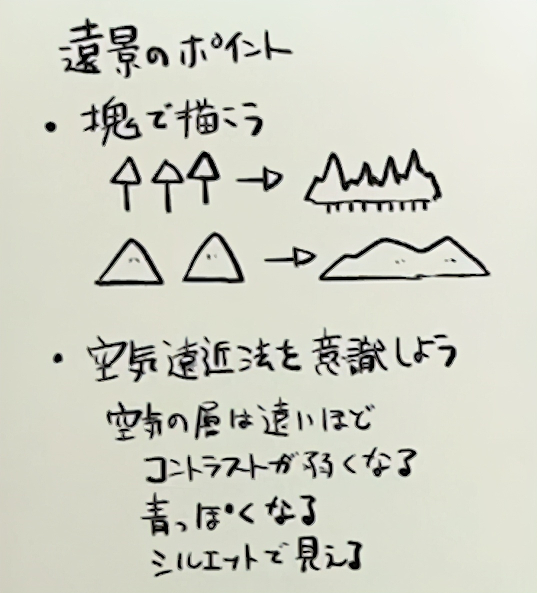 因为远处的东西看起来不是细小的部分,而是轮廓,所以不是一个接一个地画树和山,而是森林作为山的一串成块的话就容易画出来了。?