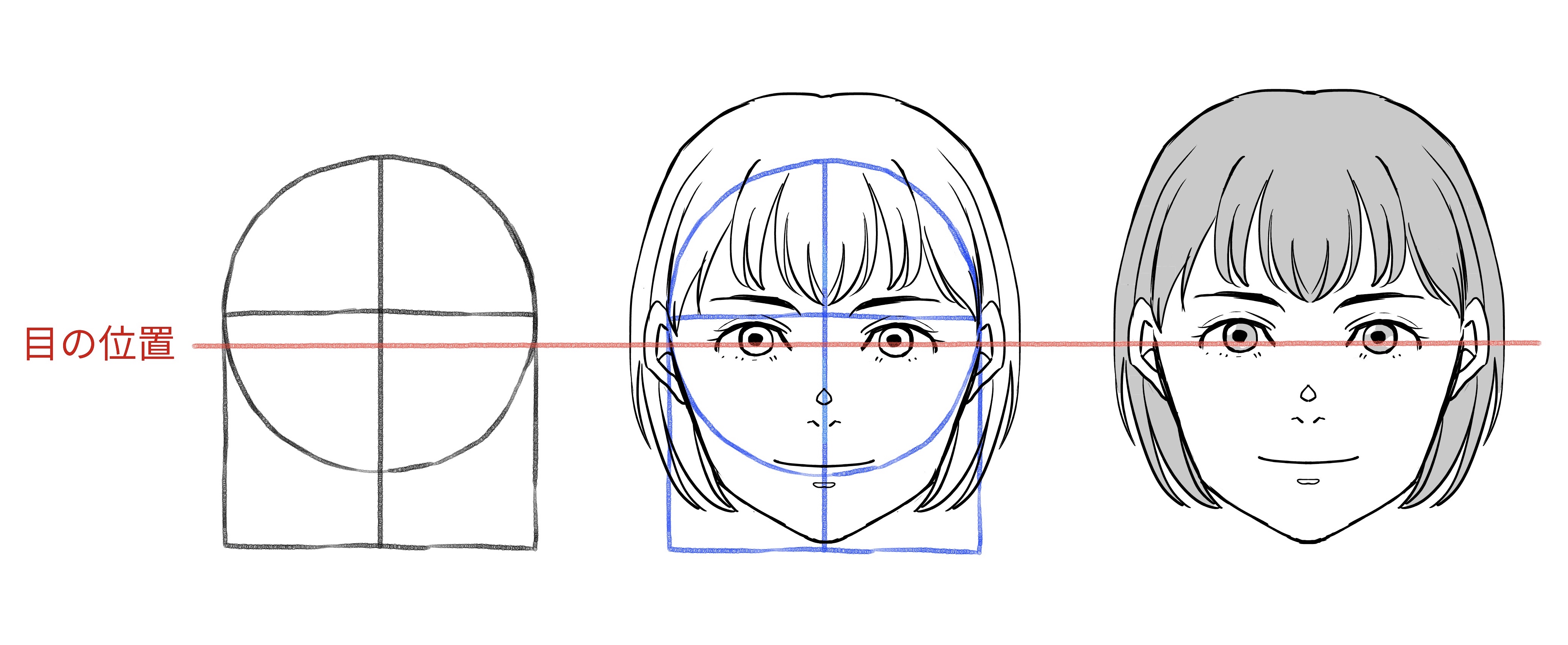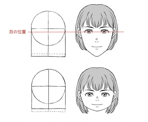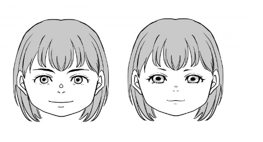 小孩子可以通过缩短从眼睛到下巴的宽度并在底部收集部分来表现更多的孩子气,或者通过绘制大黑眼睛和眼睛以外的小面部部分。