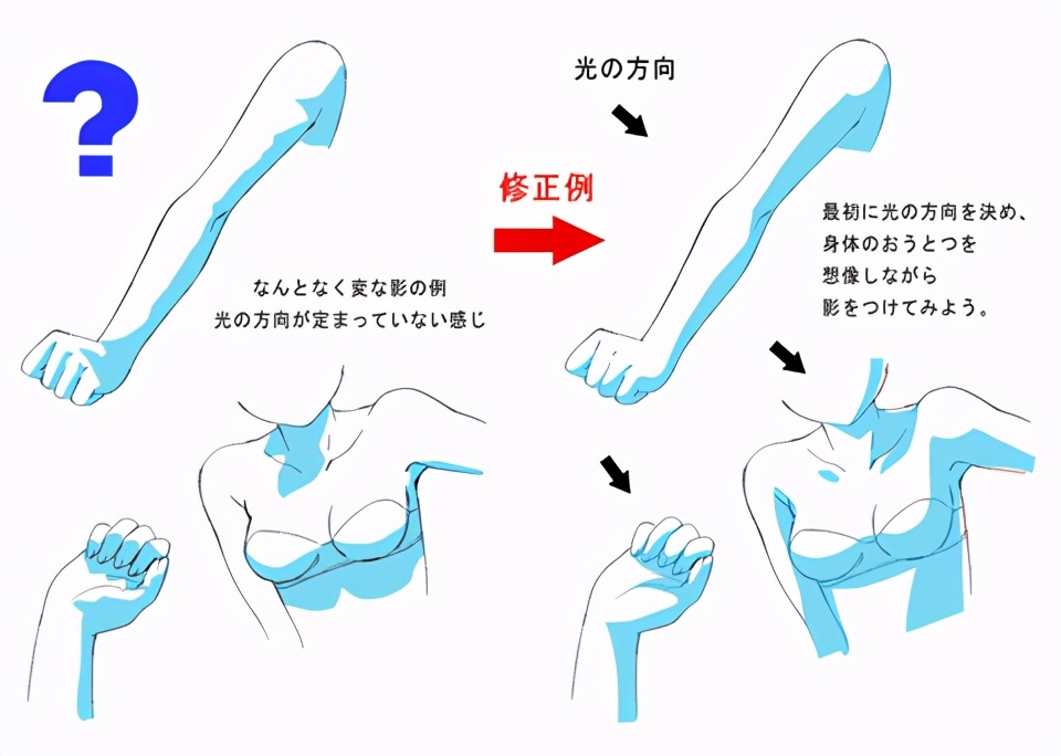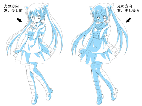 下面的例子是一个类似动漫的阴影的例子。(常见的阴影投射模式)投射阴影时,请考虑“光线来自哪里”。