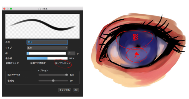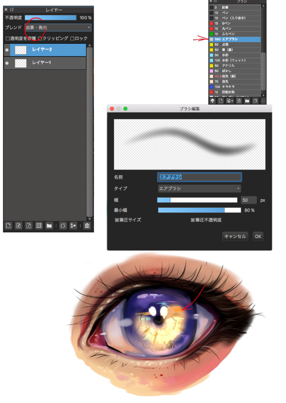 想发光的时候。双击喷枪来改变设定吧,通过混合(加法)创建新的图层,使用明亮的颜色吧。在这里使用黄色演出着瞳孔中心部的光。