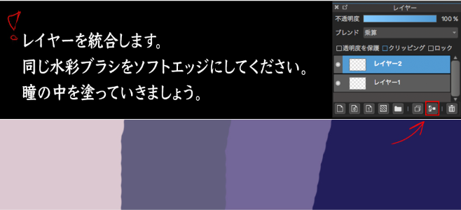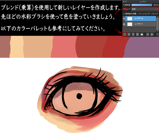 使用混合(乘法)创建新图层。用刚才的水彩刷上色吧。也请参考以下调色板。