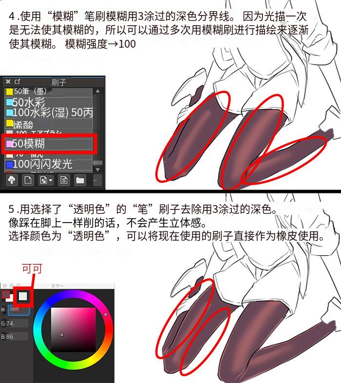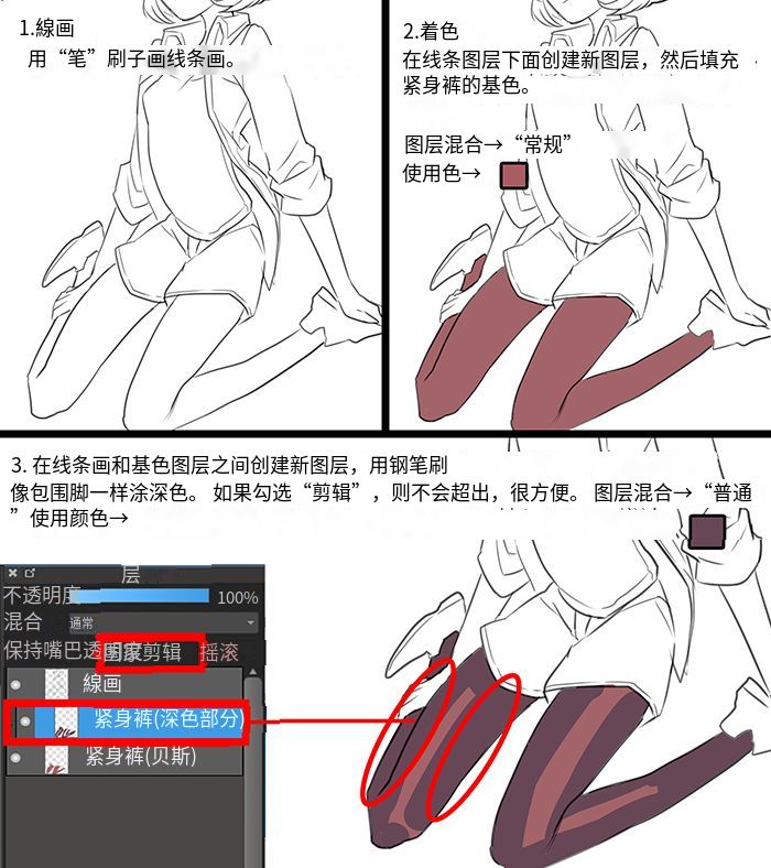 正如图片中所解释的。我会在考虑腿部曲线和光线照射的位置的同时进行绘制。