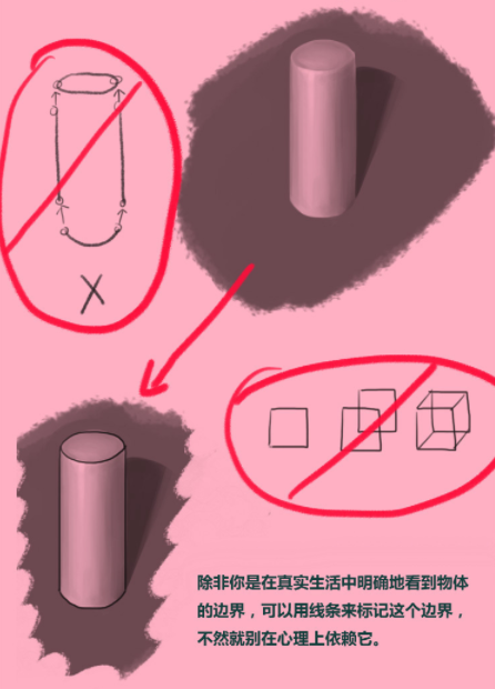 不要用线条去构成物体的形状和轮廓,立体化思考的话,构成图形的应该是光。