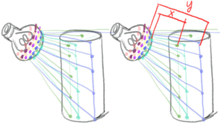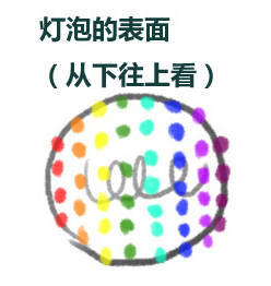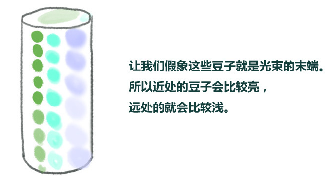 上面这图你能够学会什么?有些光豆子得跑得比较远才能撞到物体上,比如蓝色的豆子就比绿色的跑得远。所以你再想想手电筒的背后的光,是不是意味着位置靠后的光豆子就比较没那么亮!而且也比较浅!