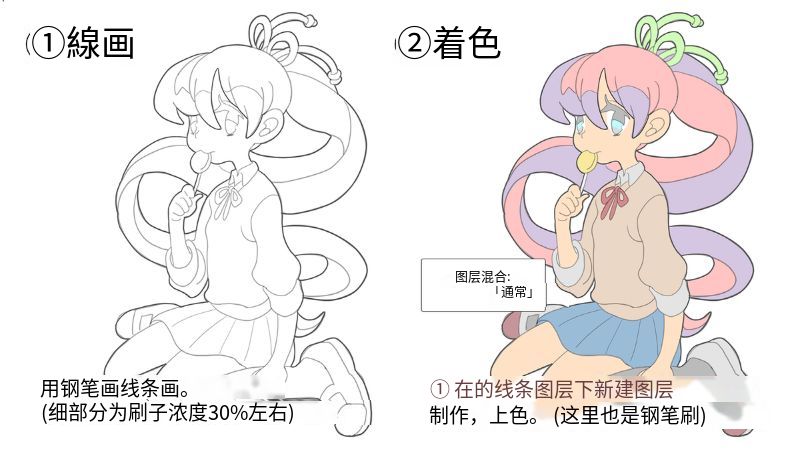 如果在上色时应用过深或过亮的颜色,颜色会漂浮并变得不平衡。让我们在观察整个情况的同时进行绘画。