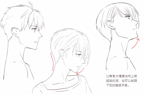 如果为了表现脖子的纤细而在描绘时采用了变形手法的话,往往一个弄不好就会让角色的下巴看起来有鞋拔子的感觉。如果对这一点很在意的话,大家可以尝式给角色描绘大幅度收紧下巴的姿势。这样一来,不光下巴的部分不等引人注意,头后部的线条看起来也会更加流与自然。