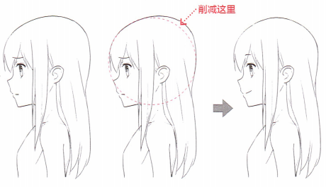如果头部形状怎么看都有点笨拙士气的感觉,我们可以先确认一下她的头后部是否有膨胀感。这时我们就要先沿刘海描绘出一个等同于头部尺寸的圆形,然看消减掉头后部超出了这个圆形范围的部分。