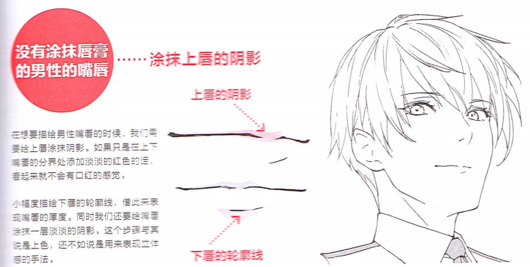在想要描绘男性嘴唇的时候,我们需要给上唇涂抹阴影。如果只是在上下嘴唇的分界处添加淡淡的红色的话,看起来就不会有口红的感觉。