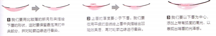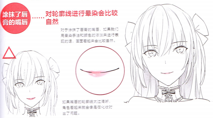 对于涂了唇膏的嘴唇。如何我们用晕染额手法和颜色的谈浓来进行表现的话,画面看起来比较自然。