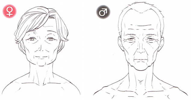 到了中年的这个年纪男性和女性的上眼睑与面部都变得松弛。他们的眼睛都比较细,外眼角容易表现松弛状态,对于这个年纪的人物还不用把额头的皱纹描绘的太明显,