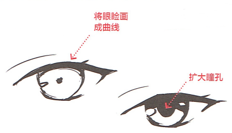 左图从骨骼构造来说,女性眼睛的轮廓比较浅,因此我们要采用变形手法,让角色的眼睛看起来又大又圆,足够女性化。这时我们要用曲线来描绘眼险,把黑眼珠和瞳孔(黑眼珠的中心)画得大一些。如果多加一些高光的话,眼睛就会拥有闪闪发亮的感觉。