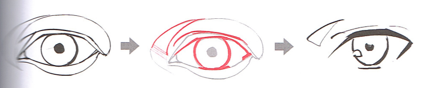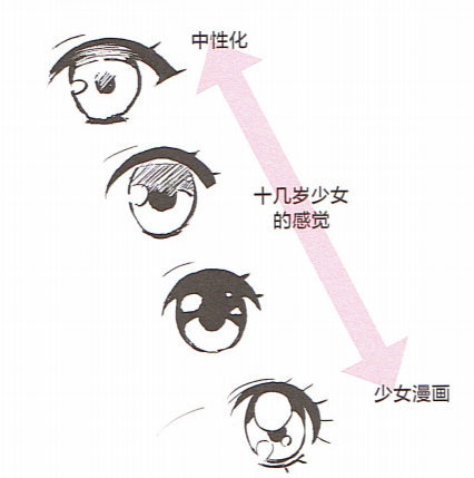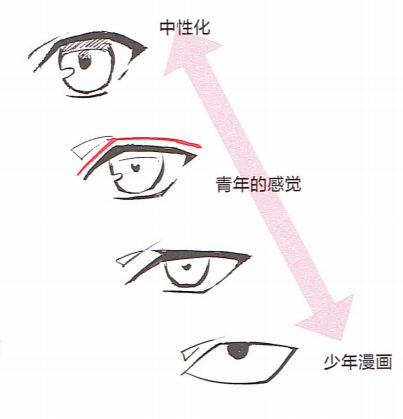 如果黑眼珠比较小、形成三白眼状态的话,角色的男性化程度就会有所加强。如果极端缩小眼珠并简化眼脸的话,角色看起来就像是少年漫画的风格了。