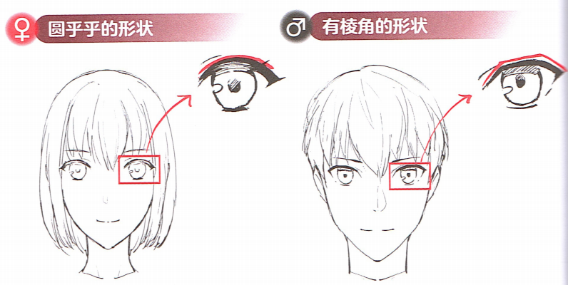 眼睛是用来表现角色感情的重要器官。我们在进行绘制时,要让男性眼睛的轮廓深一些,让女性的眼睛看起来又大又圆,借此来表现男女的性别差异。