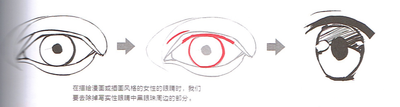 在描绘漫画或插画风格的女性的眼睛时,我们要去除掉写实性眼睛中黑眼珠周边的部分。