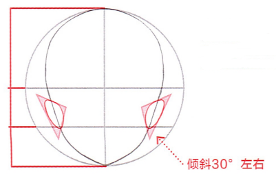 1、我们要把人物左耳和右耳描绘成压在两侧的轮廓线上的样子,耳朵上端要位于头部长度的1/2处略低也眼脸的位置,耳朵下端则要和1/4处和鼻子位置有所重叠。