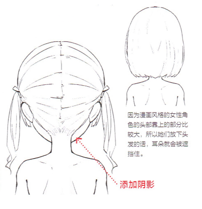 3、如果是写实性画风的话,角色的脖子根部会位于耳朵底部。如果是漫画风格的女性角色的话,她的脖子根多会比耳朵略低一些,而且我们还要调整存子的形状,让人能看到位于纤细脖子的另-一侧的下巴。