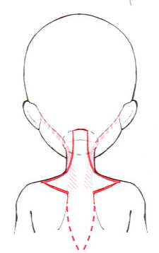 5、我们要用和脖子宽度一样的幅度来描绘后脖颈,并用类似于木碗一样的曲线在耳朵上描绘出发际线。然后再画出淡淡的肩胛骨的线条,并对肩部周围进行调整,完成描绘。