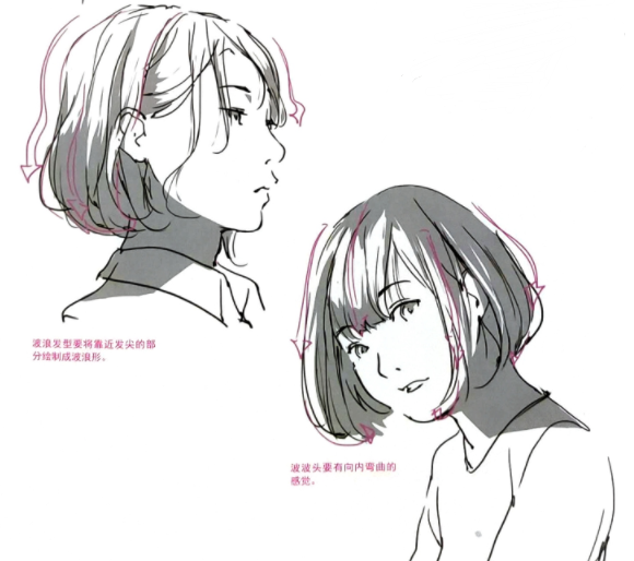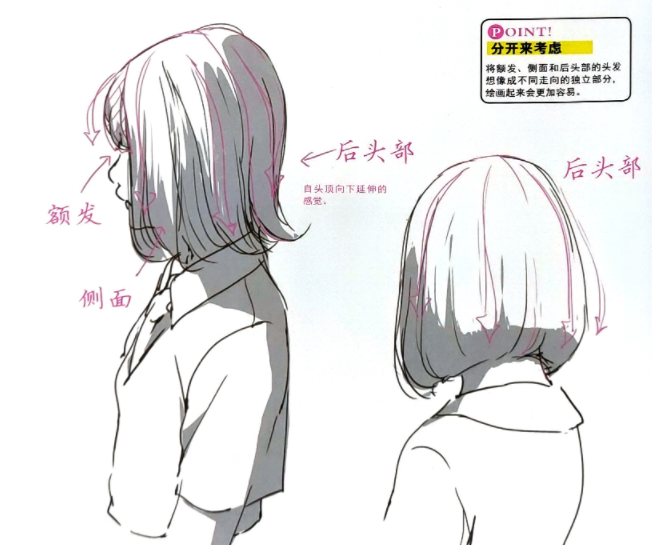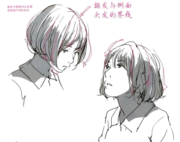tips:将额发、侧面和后头部的头发想像成不同走向的独立部分,绘画起来会更加容易。