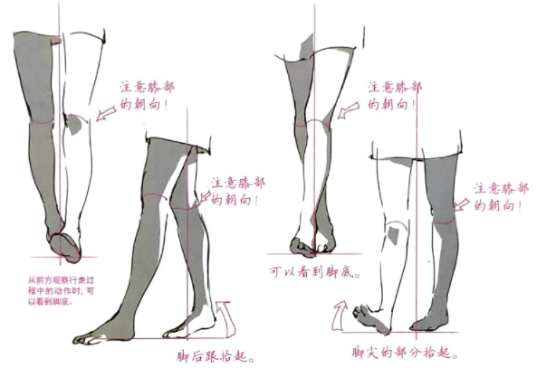 在走路的动作中,最为最要的是膝部朝向、脚背和脚底的表现。由于膝部的朝向就是腿行走的方向,因此准确把握膝部的朝向尤其重要。此外,脚背和脚底如何绘制,会改变脚部的角度。只要能做好这些,那么无论在各种情形下就都能绘制出自然的脚部了。