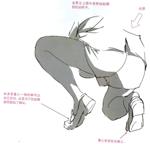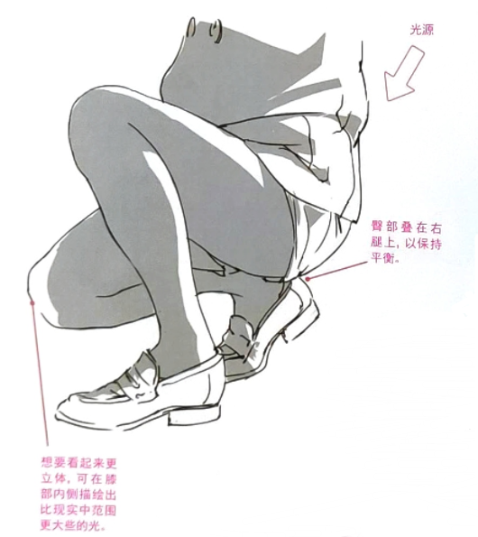 下蹲时腿部的平衡,最为重要的包含膝部的角度、大腿和小腿肚的压迫、脚踝至脚尖的弯曲程度,以及脚部的接地面这几个方面。光是听起来就有些复杂,但请大家在绘画时一定要注意这4点。