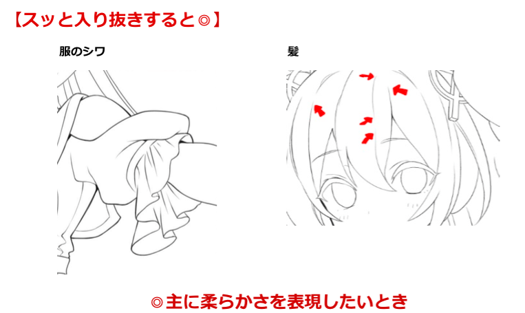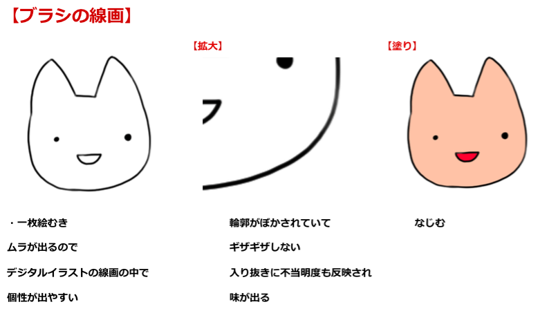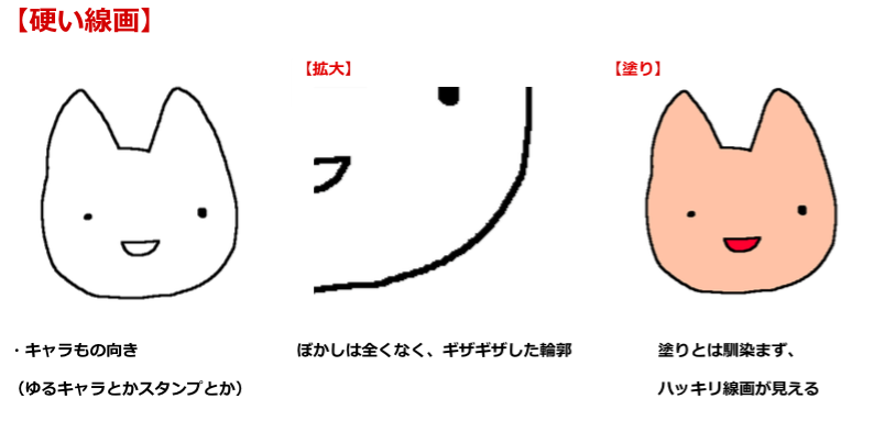 用硬线画图,放大看,线条会带有细小的“锯齿状”。使用硬线图绘制的插画,线条和画纸不会有“融合”的感觉,因此线条看起来会很清晰。比较适用于一些需要看重线条(例如松散的字符和图章)的字符和插图。