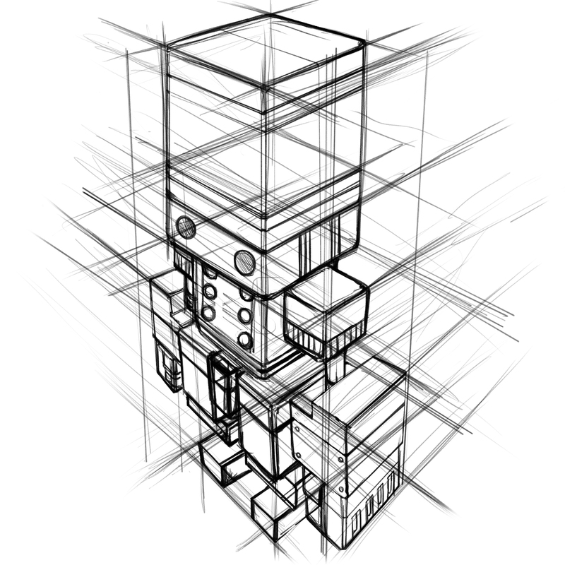 确定正面和侧面设计后,将每个形状替换为简单的形状,例如立方体或球体。在此基础上,沿所需的角度和构图绘制一个草图。这一次,我把它放在一个与对角线有一个小角度的构图中。沿着这个毛坯水平和垂直添加辅助线。
