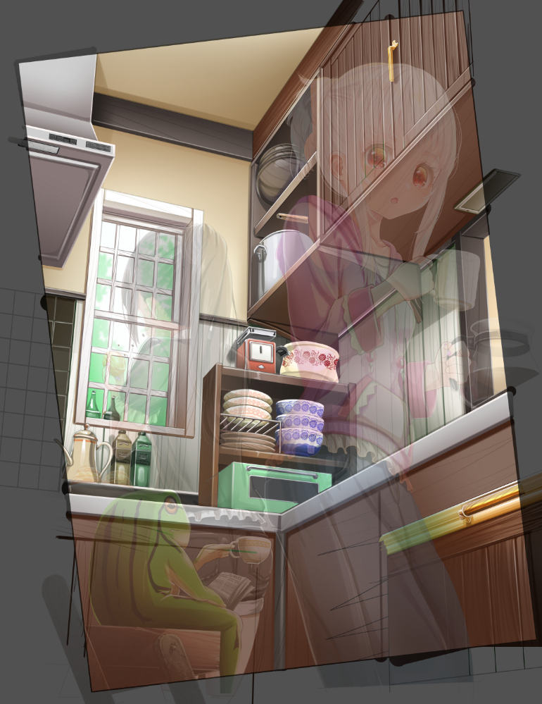 这次是树木多的厨房,作为厨房的经典小物件,画了盘子和水壶等。