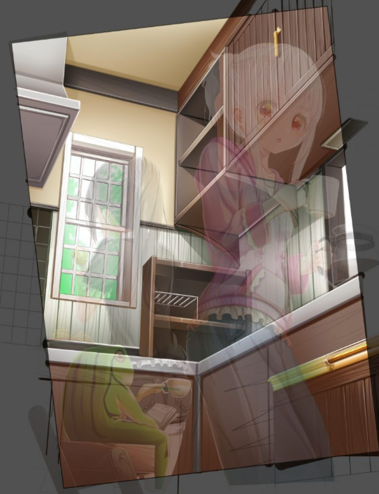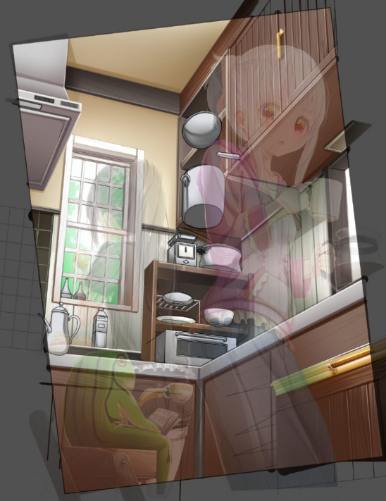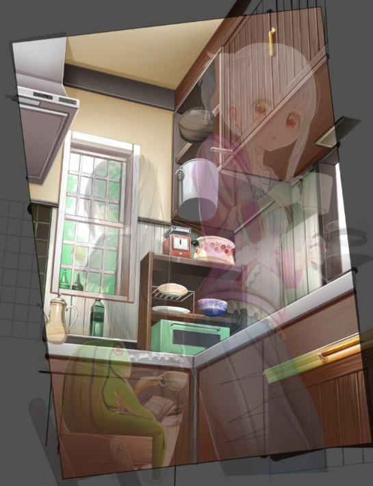 在重叠和乘法中添加了角色影响的阴影和意识到光源的阴影,为了使角色脱颖而出,将背景显眼的地方涂得很薄,隐藏了对比度。