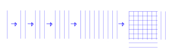 通过绘制垂直线条,然后复制,横向移动,重复合并,复制和偏移,可以绘制等间隔的线条。