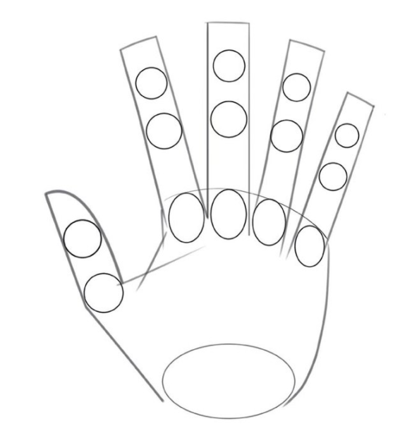 为了不让手指变成普通的棍子,让我们理解肉和皱纹的做法,使其看起来“像手掌”。
