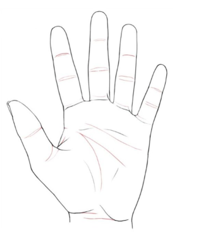 3、去掉轮廓后,画上母指球筋等肉球的线条和手指的根部、大拇指的皱纹等。