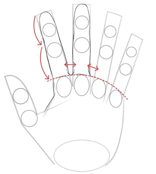 2、沿着关节加厚手指。 关节部位隆起,关节和关节之间要苗条一点。 另外,手指和手指之间用被称为蹼的皮肤连接。
