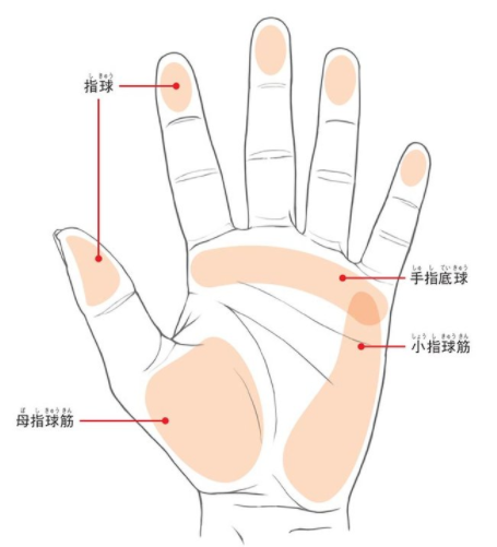 手掌主要有指尖的手指球、手指底球、母指球肌、小指球肌4处处的高潮。