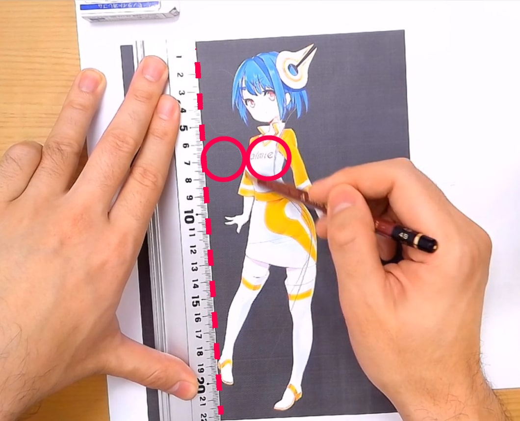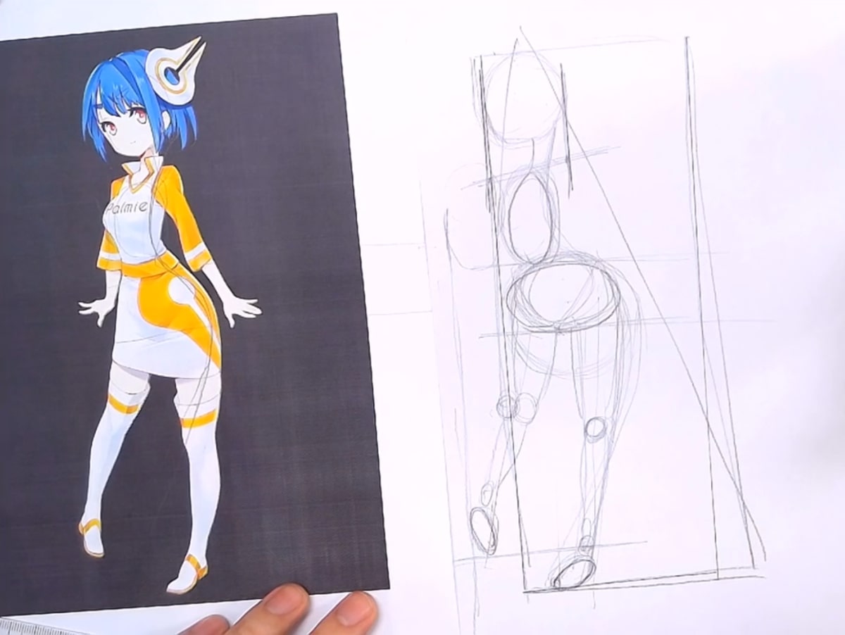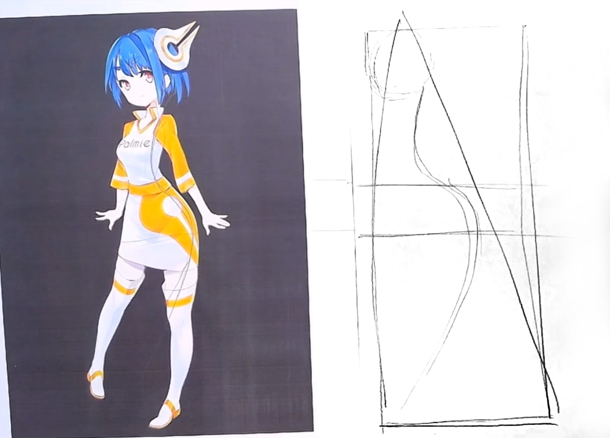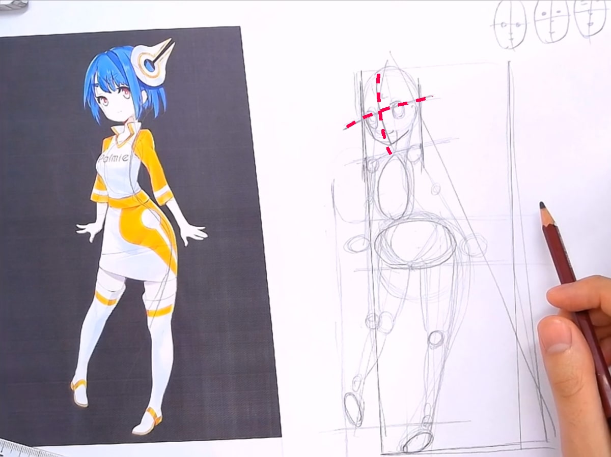 通过在脸上画十字准线来检查眼睛的高度。可以看到头部略微偏左,颈部弯曲。