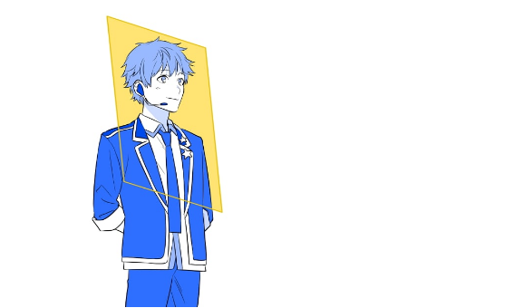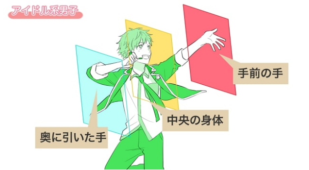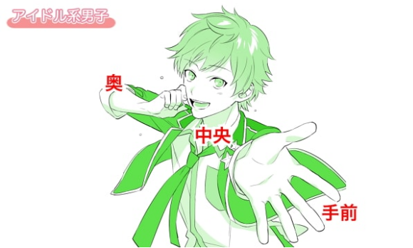 这幅画是一边唱歌一边向这里伸出手的偶像系男子的胸围。想要表现在舞台上完成唱歌和舞蹈的正统派偶像角色的帅气的时候,用有动作的姿势的画来表现这样的表演比较好。